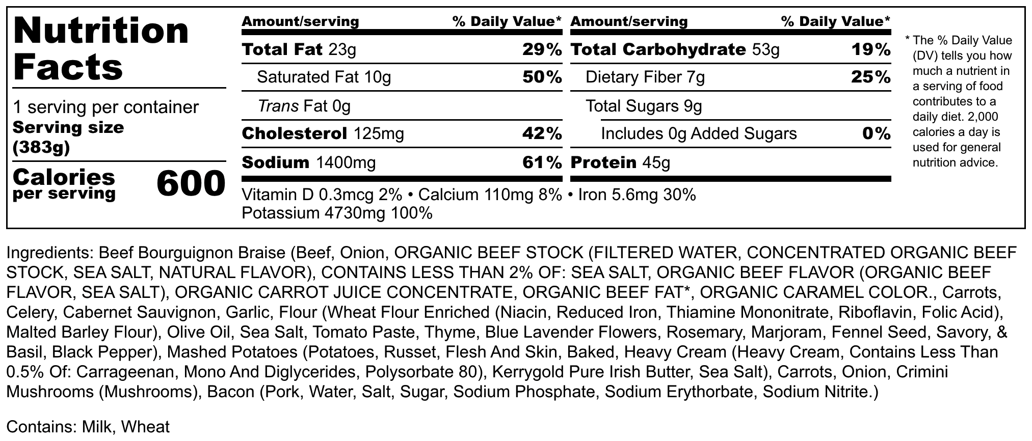 Ingredients: Beef Bourguignon Braise (Beef, Onion, ORGANIC BEEF STOCK (FILTERED WATER, CONCENTRATED ORGANIC BEEF STOCK, SEA SALT, NATURAL FLAVOR), CONTAINS LESS THAN 2% OF: SEA SALT, ORGANIC BEEF FLAVOR (ORGANIC BEEF FLAVOR, SEA SALT), ORGANIC CARROT JUICE CONCENTRATE, ORGANIC BEEF FAT*, ORGANIC CARAMEL COLOR., Carrots, Celery, Cabernet Sauvignon, Garlic, Flour (Wheat flour enriched (niacin, reduced iron, thiamine mononitrate, riboflavin, folic acid), malted barley flour), Olive Oil, Sea Salt, Tomato Paste, Thyme, Blue Lavender Flowers, Rosemary, Marjoram, Fennel Seed, Savory, & Basil, Black Pepper), Mashed Potatoes (Potatoes, Russet, flesh and skin, baked, Heavy Cream (Heavy Cream, Contains Less Than 0.5% Of: Carrageenan, Mono And Diglycerides, Polysorbate 80), Kerrygold Pure Irish Butter, Sea Salt), Carrots, Onion, Crimini Mushrooms (Mushrooms), Bacon (Pork, Water, salt, sugar, sodium phosphate, sodium erythorbate, sodium nitrite.)