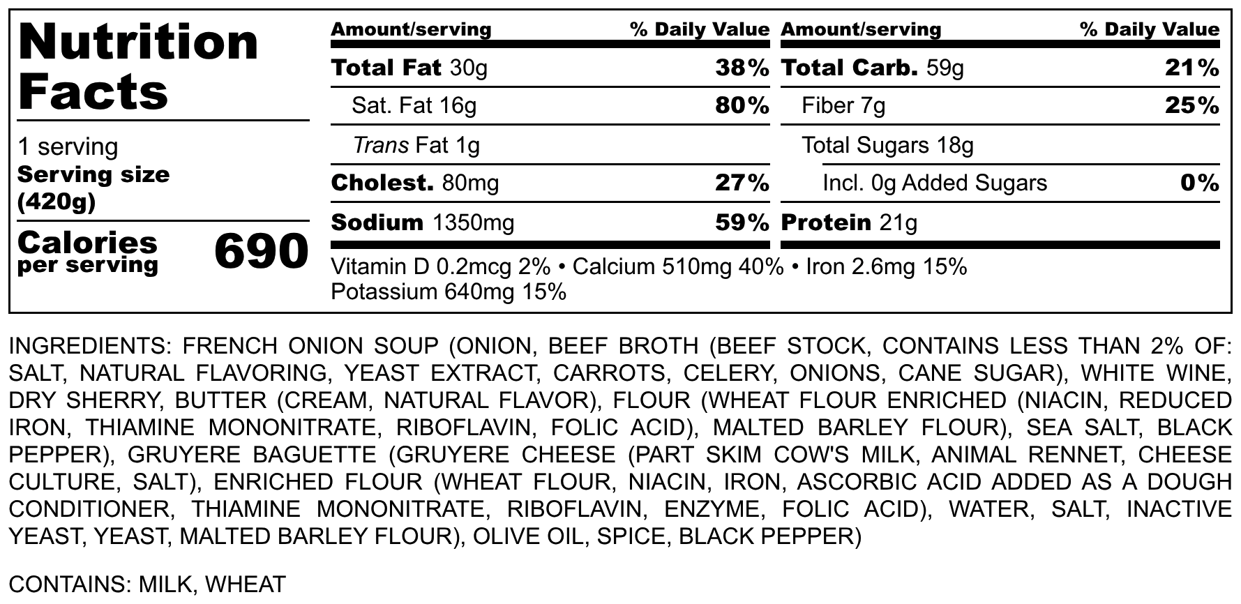 Ingredients: french onion soup (Onion, Beef Broth (BEEF STOCK, CONTAINS LESS THAN 2% OF: SALT, NATURAL FLAVORING, YEAST EXTRACT, CARROTS, CELERY, ONIONS, CANE SUGAR), White Wine, Dry Sherry, Butter (Cream, Natural Flavor), Flour (Wheat flour enriched (niacin, reduced iron, thiamine mononitrate, riboflavin, folic acid), malted barley flour), Sea Salt, Black Pepper), Gruyere Baguette (Gruyere Cheese (Part Skim Cow’s Milk, Animal Rennet, Cheese Culture, Salt), Enriched flour (wheat flour, niacin, iron, ascorbic acid added as a dough conditioner, thiamine mononitrate, riboflavin, enzyme, folic acid), water, salt, inactive yeast, yeast, malted barley flour), Olive Oil, Spice, Black Pepper)